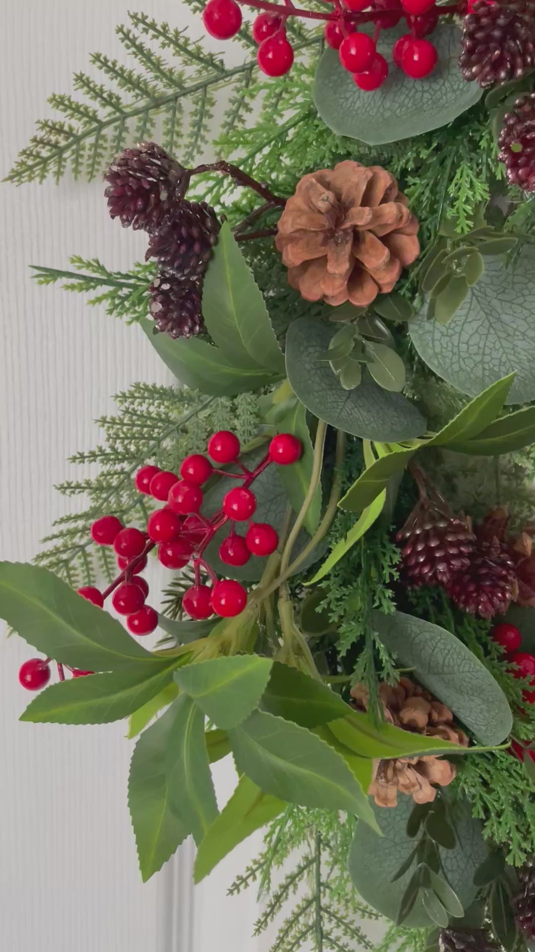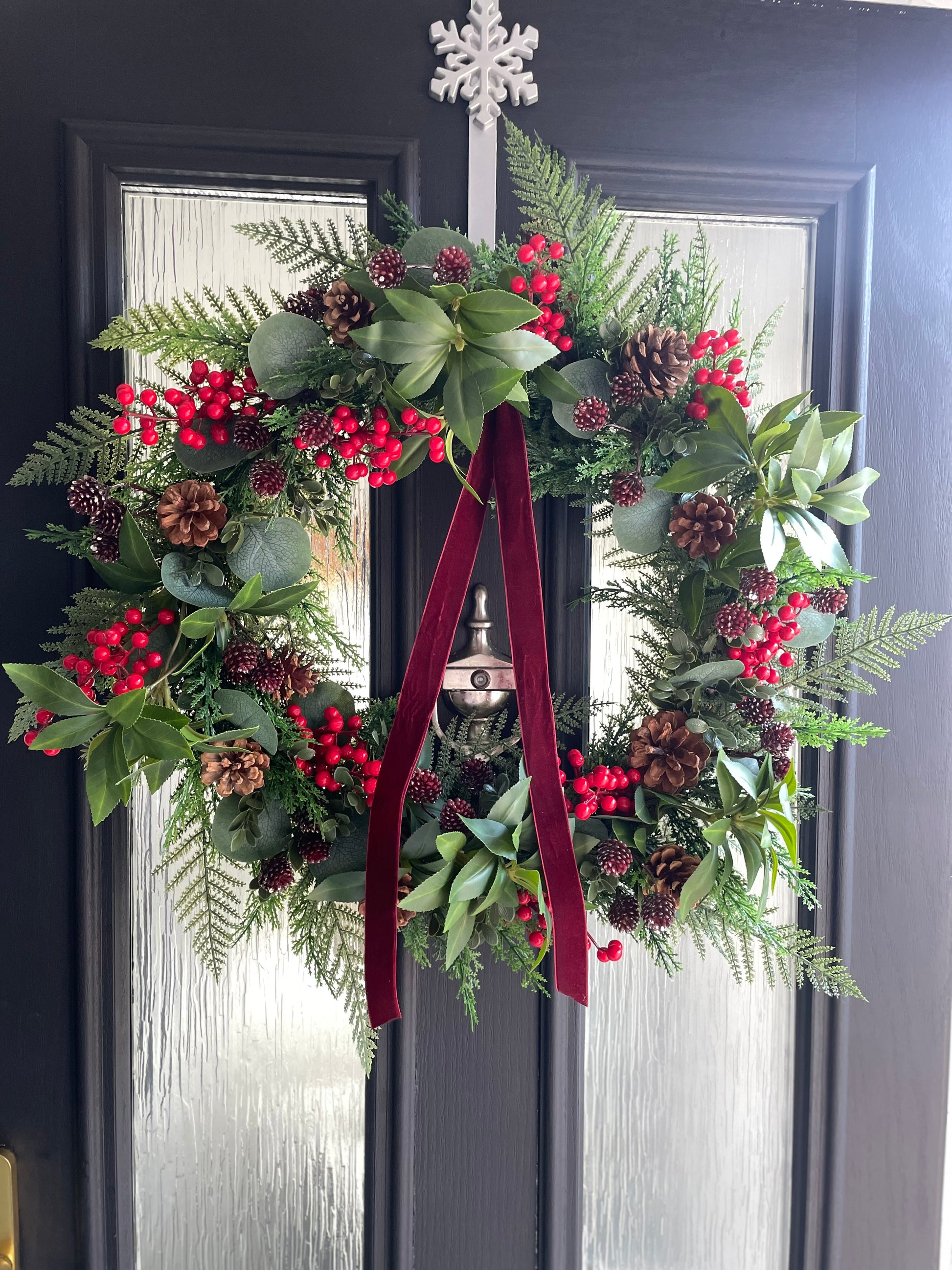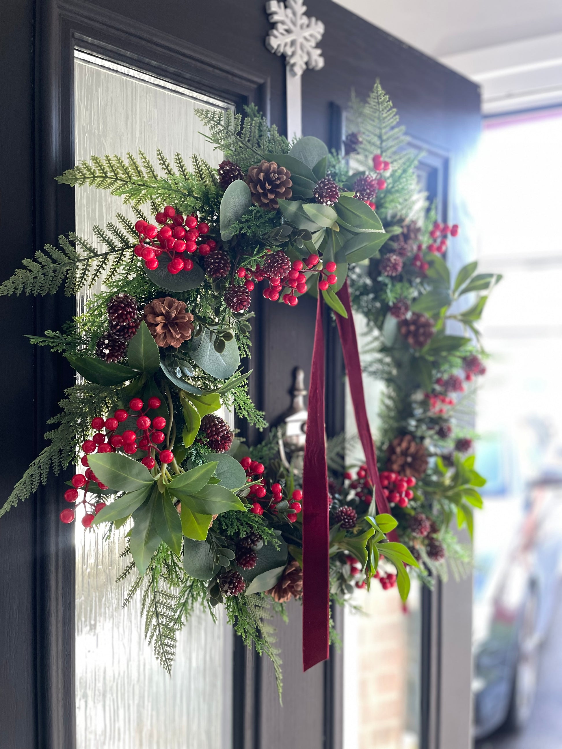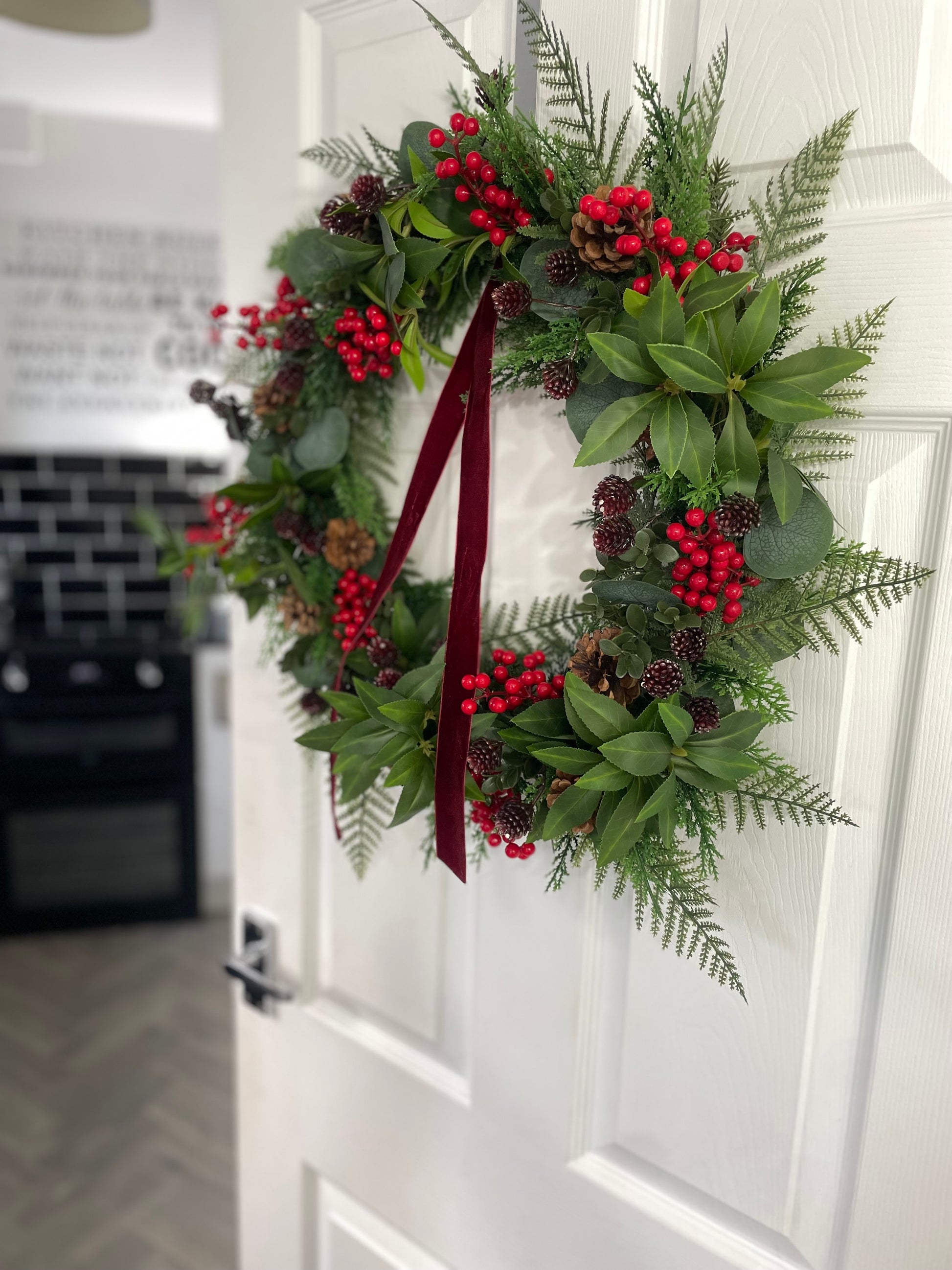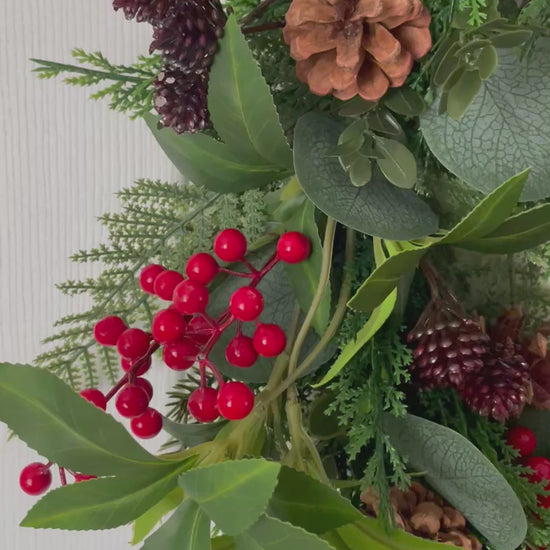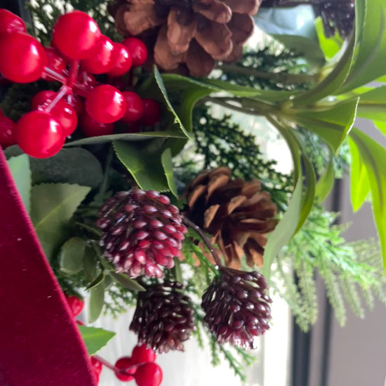 This wreath features a lush mix of lifelike greenery, including fir sprigs, fern fronds and deep green foliage, arranged to create a full and natural look. Clusters of bright red berries and rustic pinecones add festive detail, while a luxurious burgundy velvet ribbon drapes beautifully for a timeless finish.