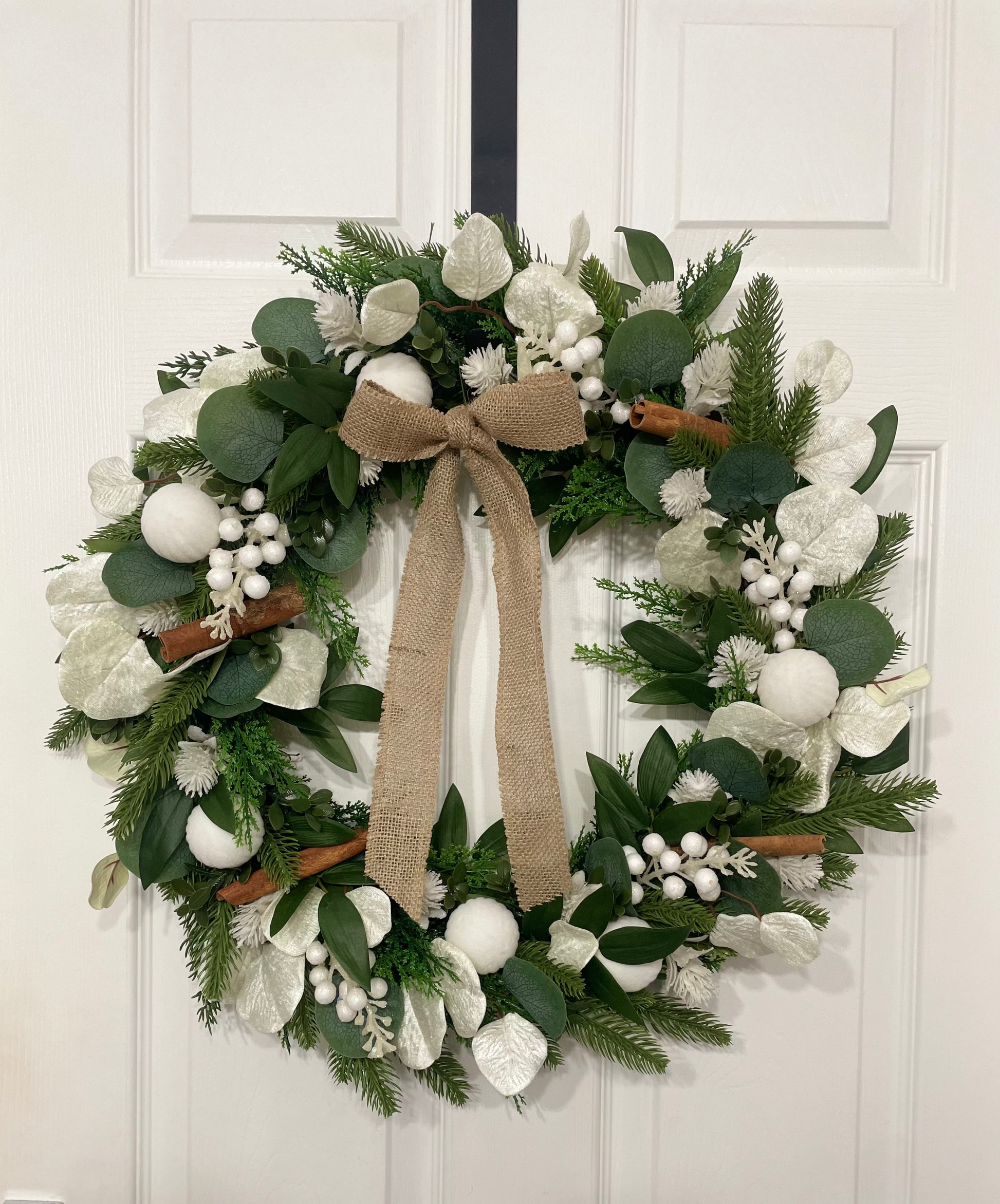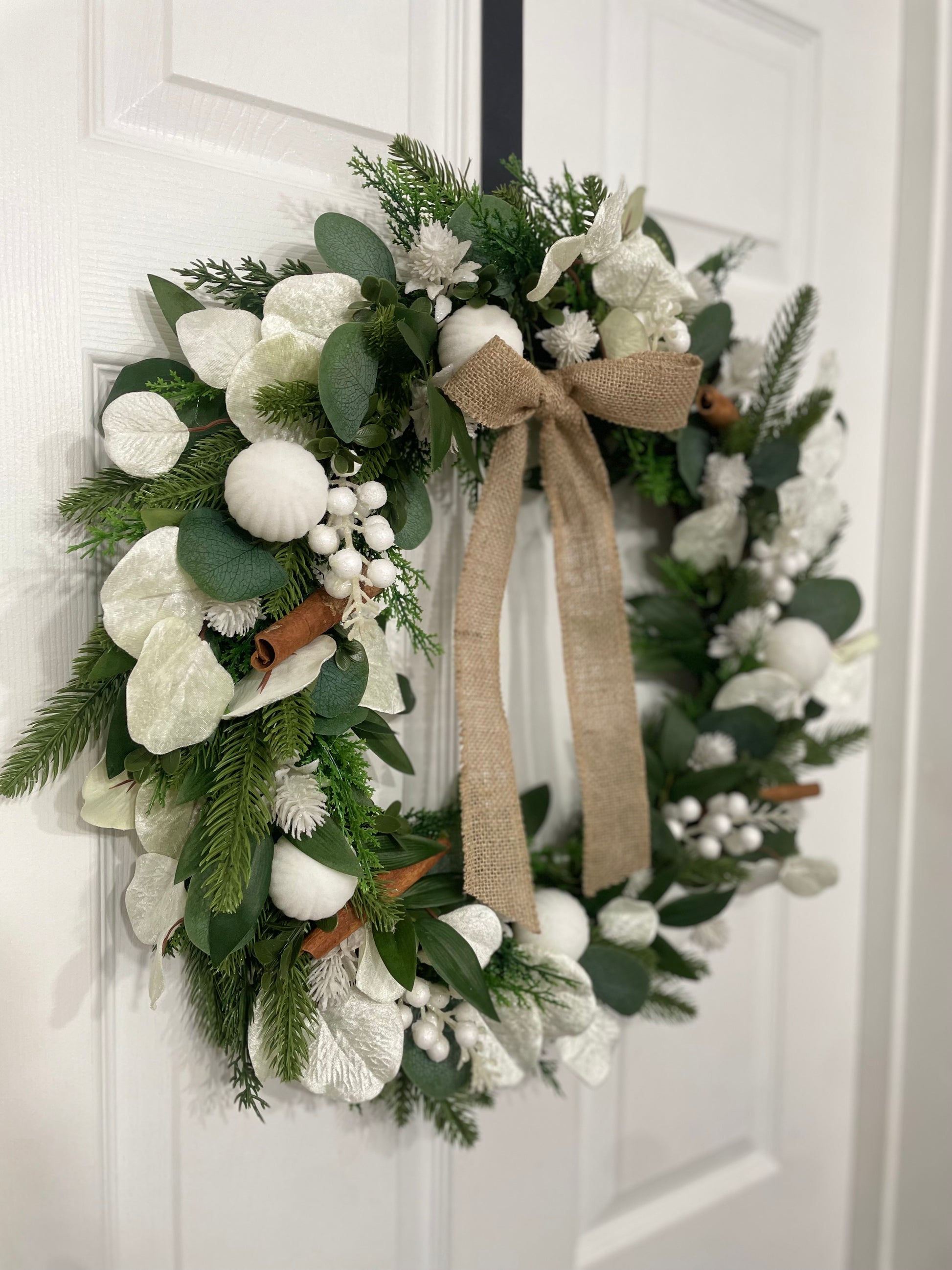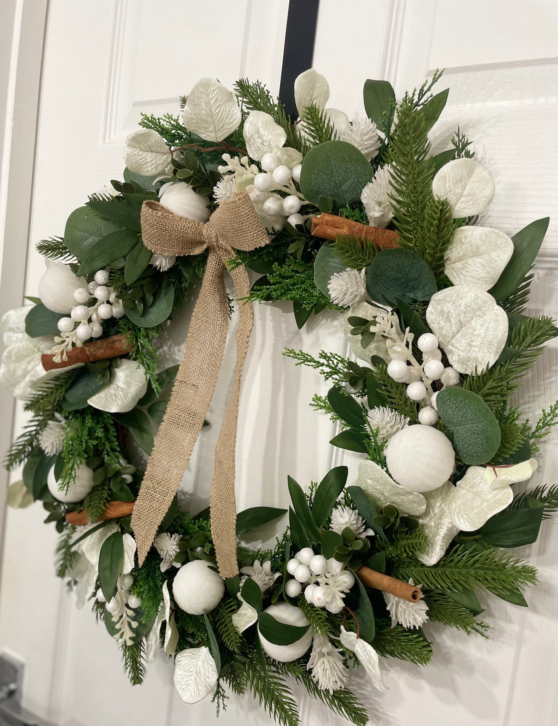 Bring elegant winter charm to your home with this handcrafted 50cm luxury faux wreath, designed with a full mix of soft evergreen foliage, frosted white berries, delicate white leaves, and gentle snow-kissed accents. Natural cinnamon sticks add a warm, subtle rustic touch that beautifully balances the cool winter tones.
