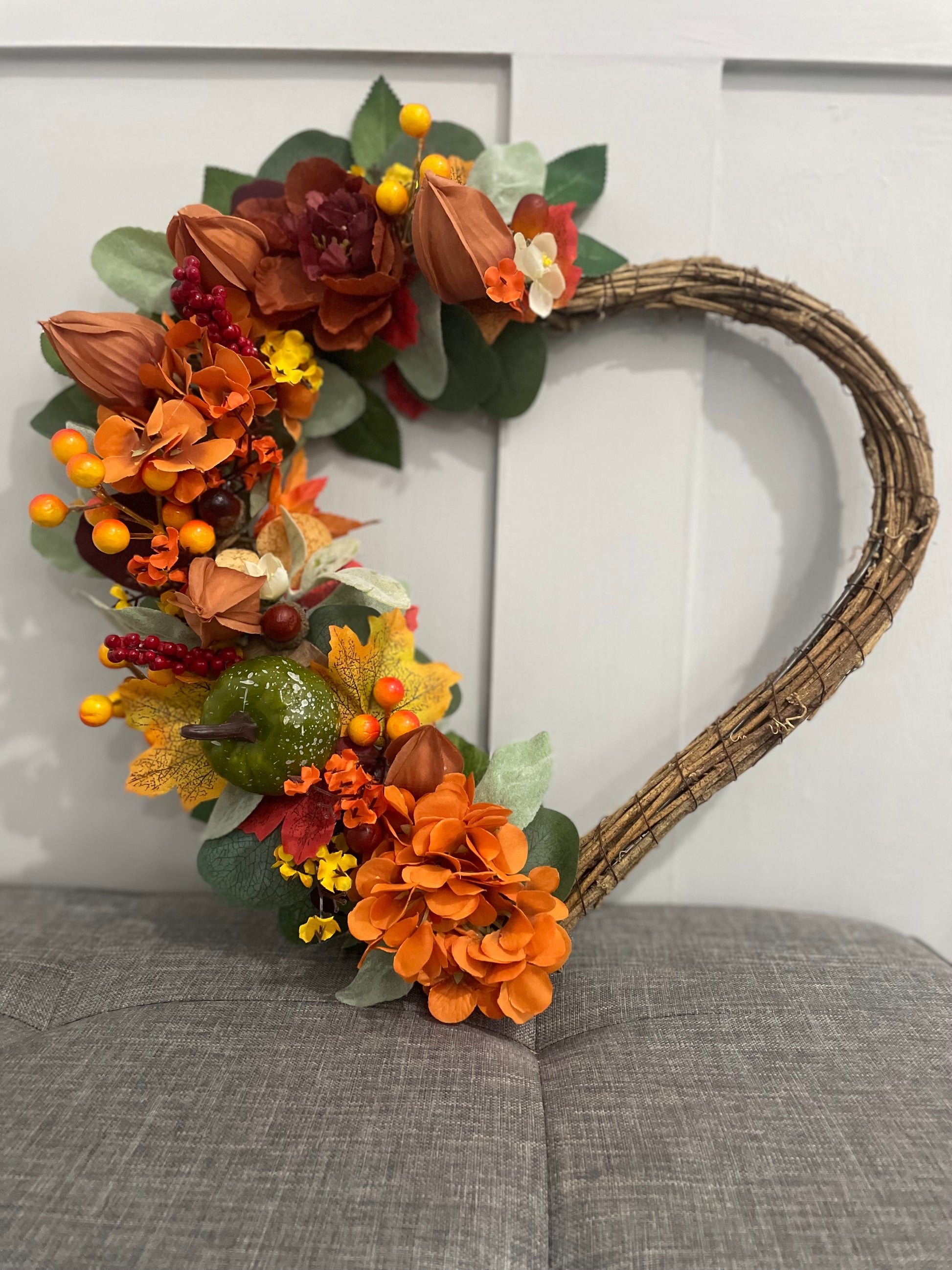 Cute heart shaped wreath base with autumnal colours of sage, burnt orange, magenta and yellow